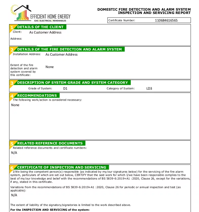 A fire alarm certificate (also known as a Fire Detection and Alarm System Inspection and Servicing Report) is a document confirming that the fire alarm system that you have installed in your property has been professionally tested and is working condition and in line with British Standards (BS 5839).